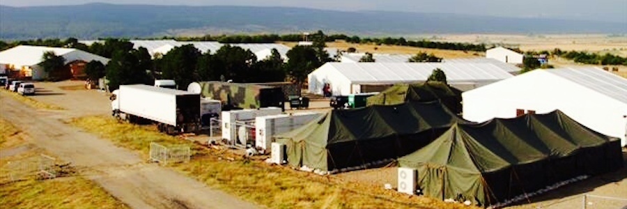 Complete set up, maintenance and disassembly of a 3-months base camp in Novo Selo, Bulgaria as well as eventual construction of the permanent camp for the Bulgarian armed forces to include ground preparation for roads, shelters and parking areas. The base camp location was a barren areal consisting of sand, shrubs, fields and rocks. We prepared the grounds and built roads, foundations for buildings and tents, pads and parking lots by gravelling and compressing the surfaces into access roads and structure foundations. More than 10,000 sqm of tents had to be set up (German type fest tents, RUBB tents and GP large & medium tents), 100 shower units, 100 toilet units, installation of 3000 m of security fence, 2 traffic control points were built, 20 clearing barrels built and set up, 20 outdoor lighting fixtures set up and connected, 24 helicopter tie-downs and 394 internal dividers installed. 6400 KW of power were supplied with a completely autarkic functioning power supply system and 10,000 cubic meters of potable fresh water and removal of 10,000 cubic meter of grey water. A complete electrical system was installed throughout the camp. Fresh water delivery and grey water removal were performed on a daily basis. All tents were equipped with air conditioning, maintaining a constant temperature of 21°. We brought master electricians, tent masters, master air conditioning technicians and master water technicians on site to execute the work in accordance with expected quality and European Union standards. Road and grounds construction was performed by a Bulgarian company.